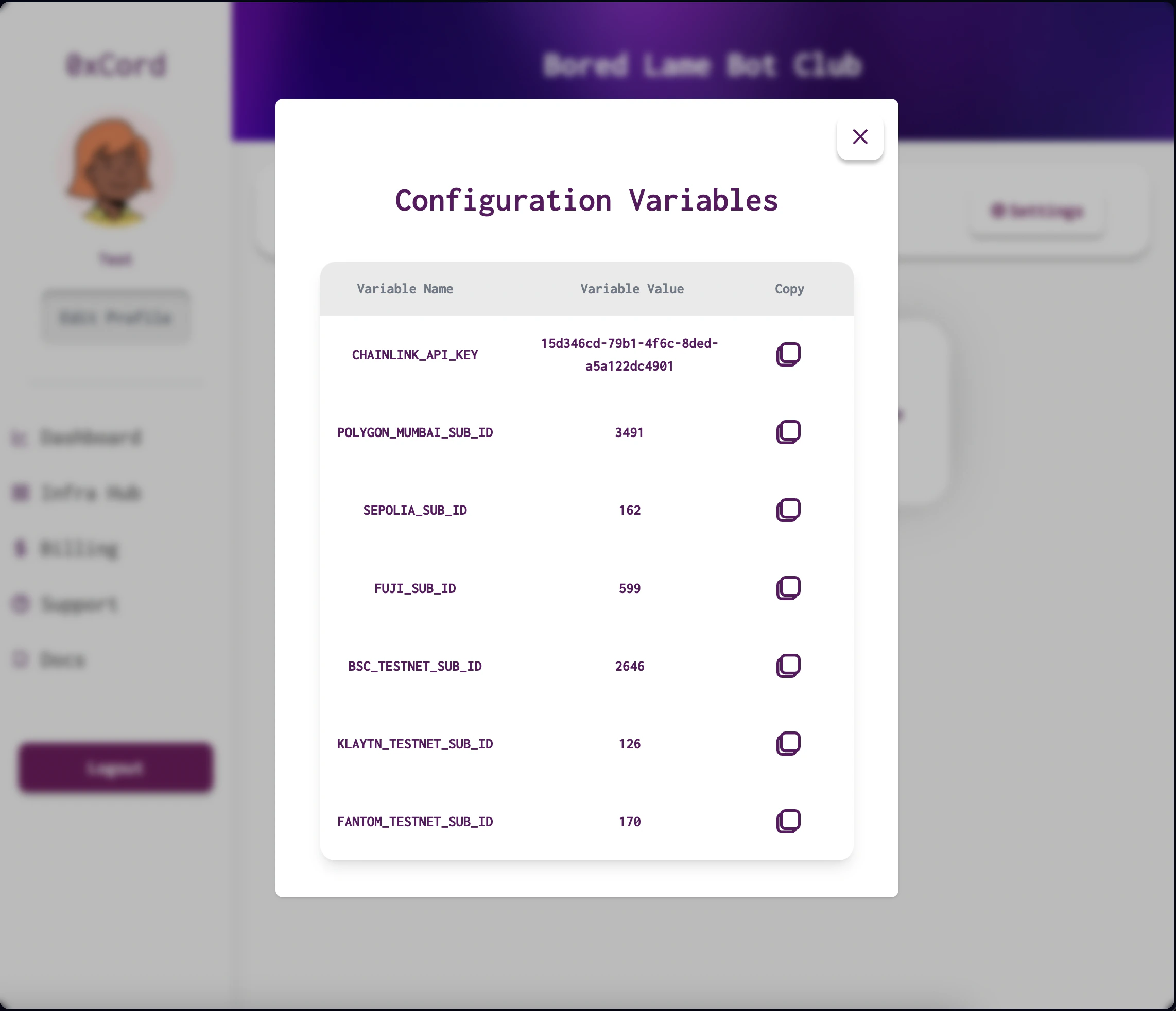 Upon provisioning infrastructure, you will receive configuration variables for your dApp. These variables are essential for connecting and authenticating with the services. Access them in the “Config Vars” section of your dApp settings.