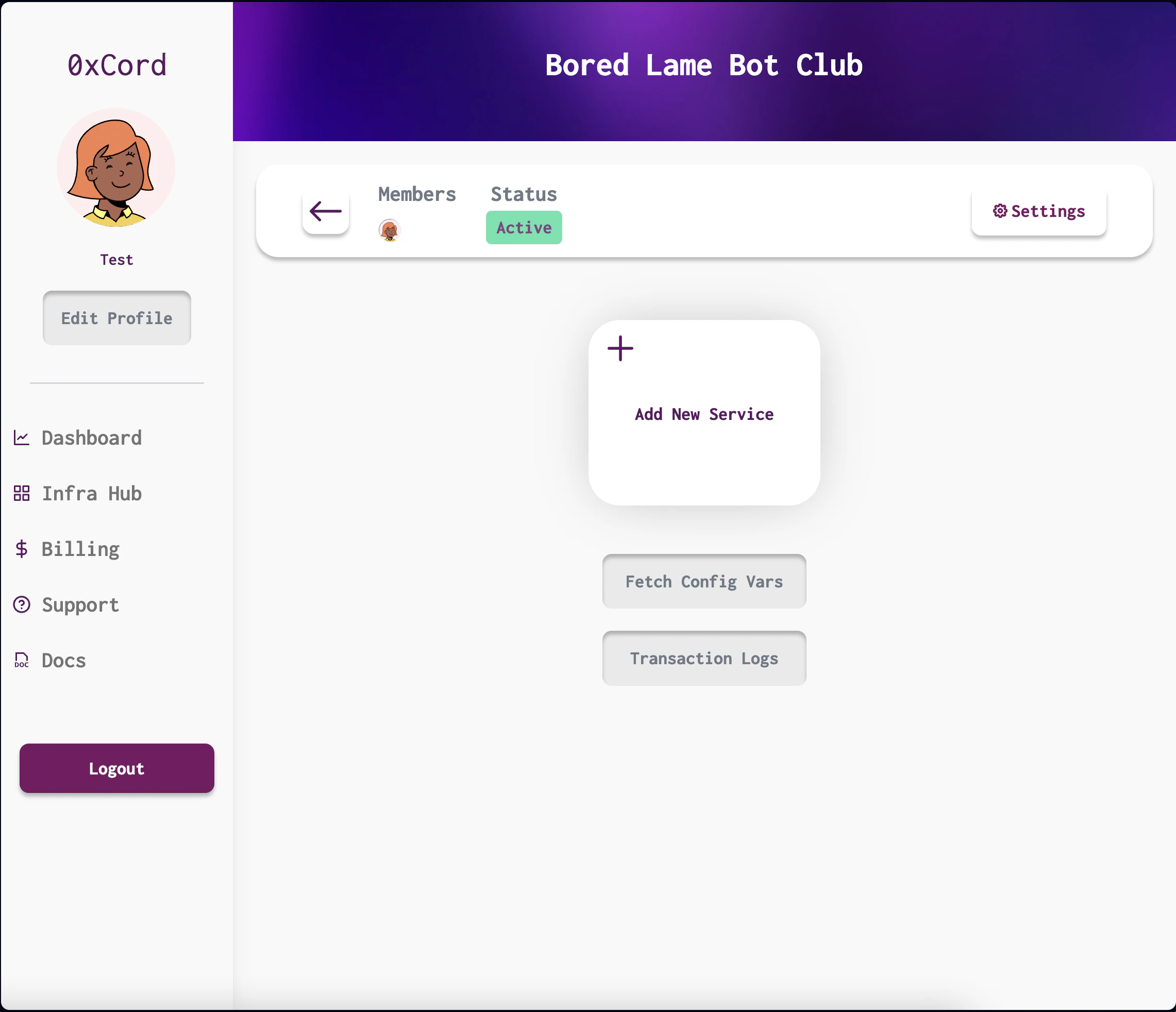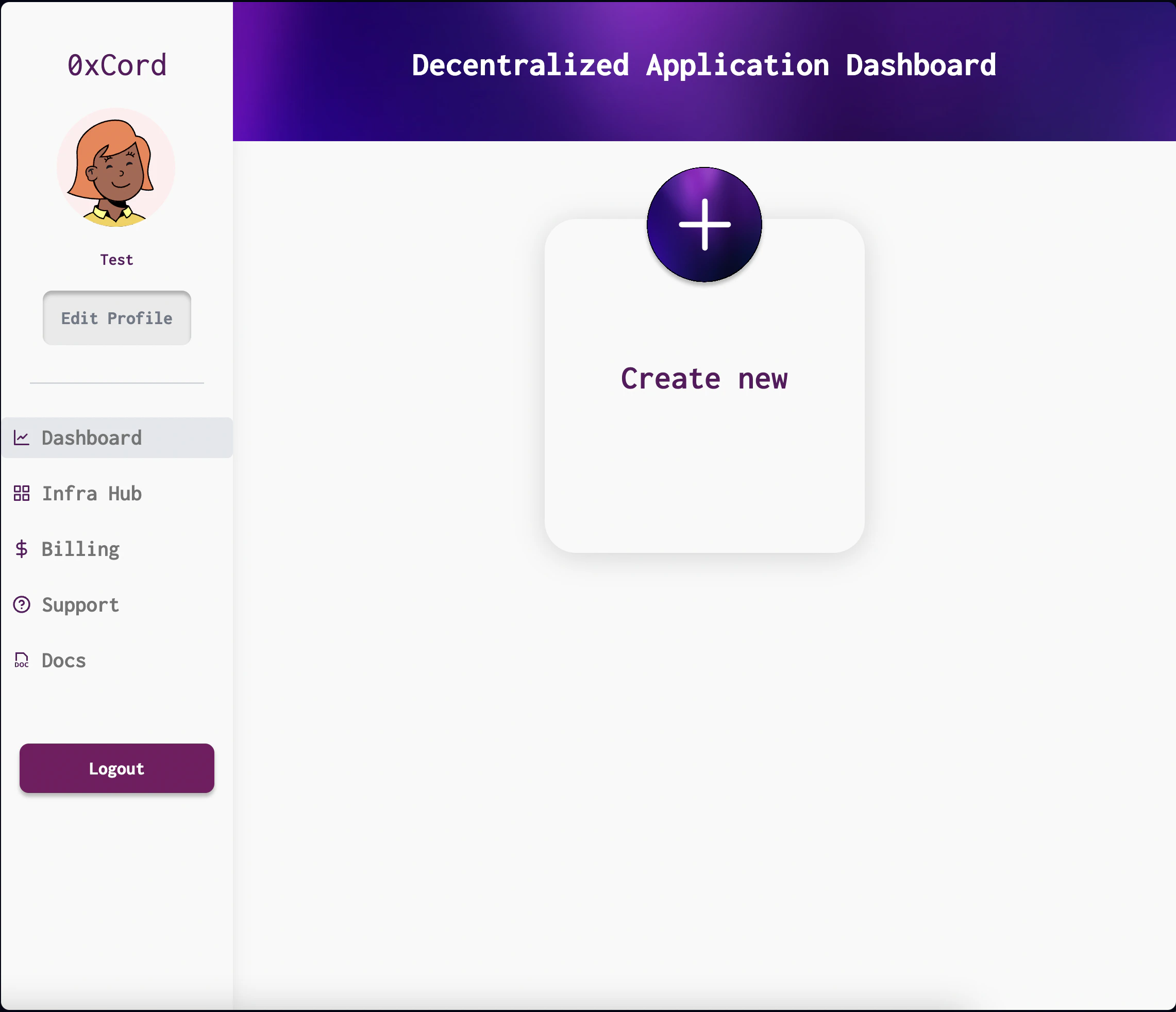Once logged in, you will be redirected to your 0xCord dashboard. Click on the “Create New dApp” button and provide a name for your dApp. Click “Create” to proceed.
