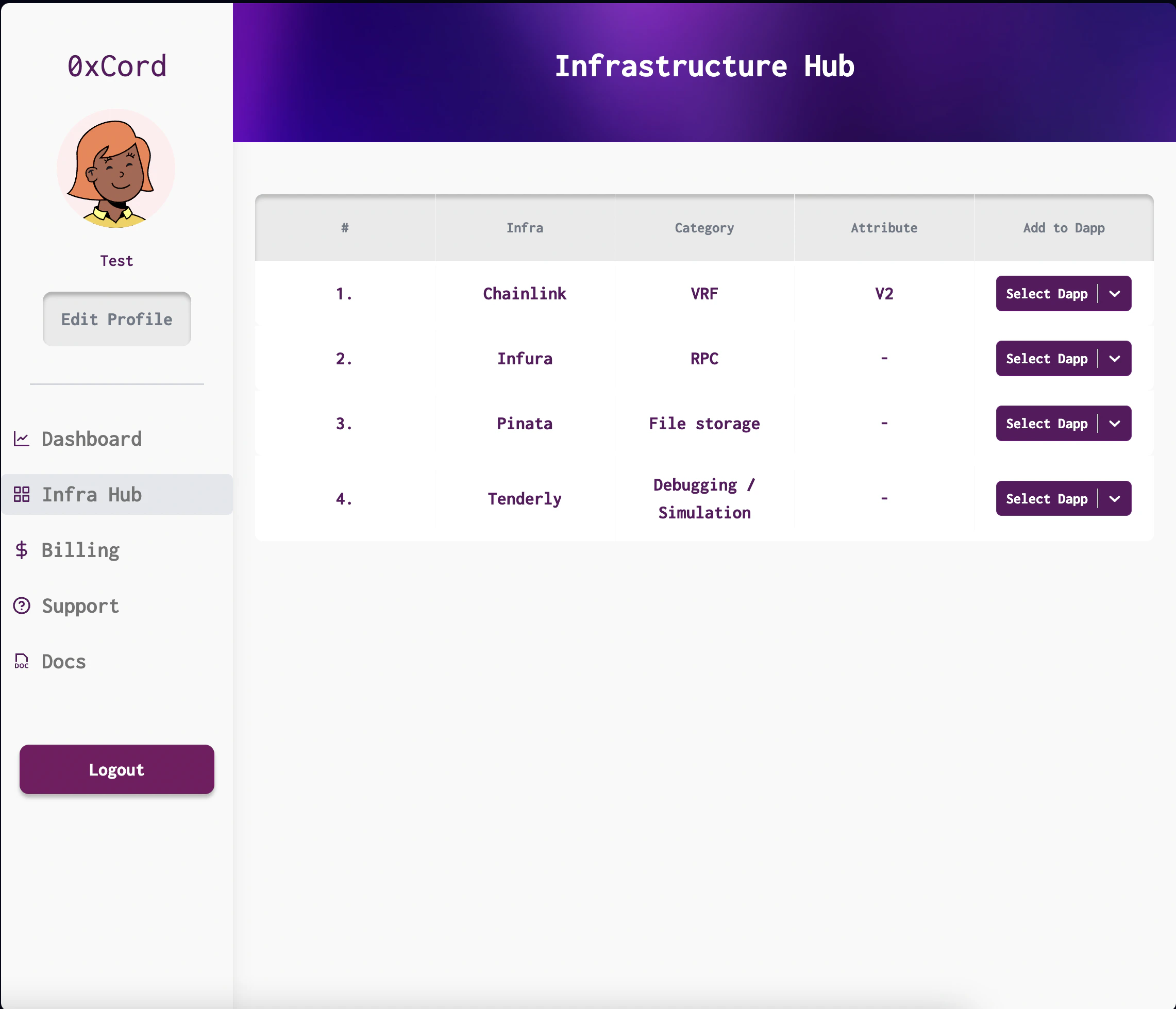 After creating your dApp, you will be taken to the Infrastructure Hub. Here, you can provision the required infrastructure for your dApp, including Chainlink and other services. To provision infrastructure, select the desired services and click “Add new Service”.